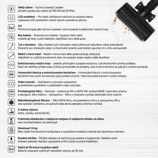 Lauben Stick Vacuum & Mop 3in1 Pet Deluxe 400BC vyniká vysokým sacím výkonom až 105 AW (až 30 kPa) a prémiovým dizajnom, kedy telo, kovové časti a kefy sú pokryté matným čiernym povrchom. Vysávač je možné použiť kdekoľvek, pretože na jeho prevádzku nepotrebuje zásuvku a nikde nepôsobí žiadne káble. Zbernú nádobu je možné ľahko vysypať pri zachovaní hygieny. Použitie vysávača je veľmi jednoduché; pre lepšiu orientáciu je k dispozícii video tutoriál.