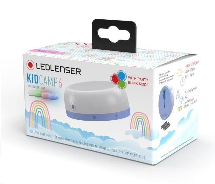 LEDLENSER KIDCAMP 6 je malá kapsická lucerna prispôsobená špeciálne pre citlivé detské oči a detskú manipuláciu. Svetlo je vhodné do stanov, karavanov, ale aj do detských izbičiek – skrátka všade, kde je potrebné osvetliť priestor príjemným neoslňujúcim svetlom. Svítilka je vybavená vstavaným hákom pre jednoduché upevnenie. Možnosť voľby zo štyroch farieb svetla a funkcie blikania navyše rozveselí každú detskú oslavu.