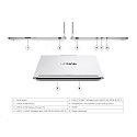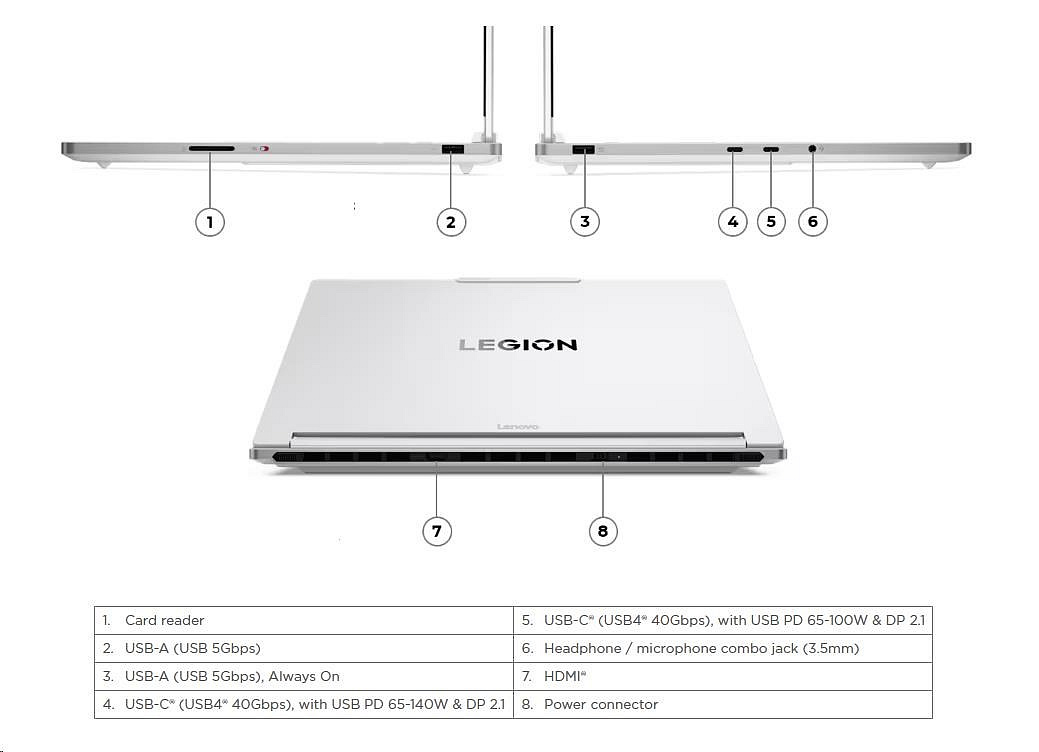 | Standartné porty | 1x USB-A (USB 5Gbps), Always On 1x USB-A (USB 5Gbps) 1x USB-C® (USB4® 40Gbps), with USB PD 65-140W and DisplayPort™ 2.1 1x USB-C® (USB4® 40Gbps), with USB PD 65-100W and DisplayPort™ 2.1 1x HDMI® 2.1, up to 8K/60Hz 1x Headphone / microphone combo jack (3.5mm) 1x Card reader 1x Slim tip Power connector |