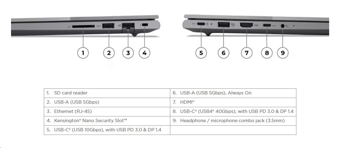 | Standartné porty | 1x USB-A (USB 5Gbps / USB 3.2 Gen 1) 1x USB-A (USB 5Gbps / USB 3.2 Gen 1), Always On 1x USB-C® (USB 10Gbps / USB 3.2 Gen 2), with USB PD 3.0 and DisplayPort™ 1.4 1x USB-C® (USB4® 40Gbps), with USB PD 3.0 and DisplayPort™ 1.4 1x HDMI® 2.1, up to 4K/60Hz 1x Headphone / microphone combo jack (3.5mm) 1x Ethernet (RJ-45) 1x SD card reader |