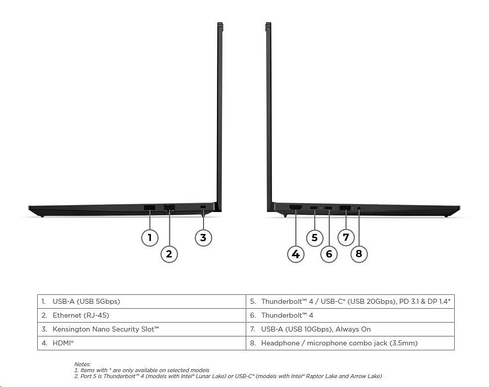 | Standartné porty | 1x USB-A (USB 5Gbps / USB 3.2 Gen 1) 1x USB-A (USB 10Gbps / USB 3.2 Gen 2), Always On 1x USB-C® (Thunderbolt™ 4 / USB4® 40Gbps), with USB PD 45-65W and DisplayPort™ 2.1 1x HDMI® 2.1, up to 4K/60Hz 1x Headphone / microphone combo jack (3.5mm) 1x Ethernet (RJ-45) Optional Ports (configured) 1x USB-C® (Thunderbolt™ 4 / USB4® 40Gbps), with USB PD 45-65W and DisplayPort™ 2.1 |