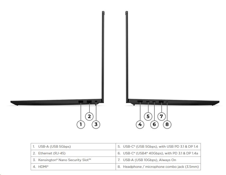 | Standartné porty | 1x USB-A (USB 5Gbps / USB 3.2 Gen 1) 1x USB-A (USB 10Gbps / USB 3.2 Gen 2), Always On 1x USB-C® (USB 5Gbps / USB 3.2 Gen 1), with USB PD 3.1 and DisplayPort™ 1.4 1x USB-C® (USB4® 40Gbps), with USB PD 3.1 and DisplayPort™ 1.4a 1x HDMI® 2.1, up to 4K/60Hz 1x Headphone / microphone combo jack (3.5mm) 1x Ethernet (RJ-45) |