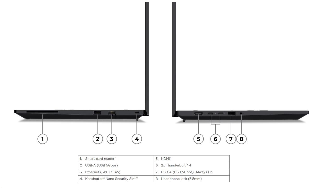 | Standartné porty | 1x USB-A (USB 5Gbps / USB 3.2 Gen 1) 1x USB-A (USB 5Gbps / USB 3.2 Gen 1), Always On 2x Thunderbolt™ 4, with USB PD 3.0 1x HDMI® 2.1, up to 4K/60Hz 1x Headphone / microphone combo jack (3.5mm) 1x Ethernet (GbE RJ-45) 1x Security keyhole 1x Smart Card Reader |