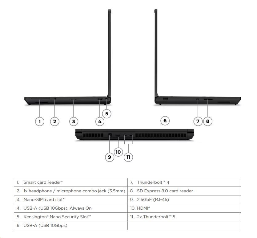 | Standartné porty | 1x USB-A (USB 10Gbps / USB 3.2 Gen 2), Always On 1x USB-A (USB 10Gbps / USB 3.2 Gen 2) 2x Thunderbolt™ 5, with DisplayPort™ 2.1 and USB PD 3.1, 180W input / 15W output 1x Thunderbolt™ 4, with DisplayPort™ 2.1 and USB PD 3.1, 180W input / 15W output 1x HDMI® 2.1, up to 8K/60Hz 1x Headphone / microphone combo jack (3.5mm) 1x Ethernet (2.5GbE RJ-45) 1x SD Express 8.0 card reader |