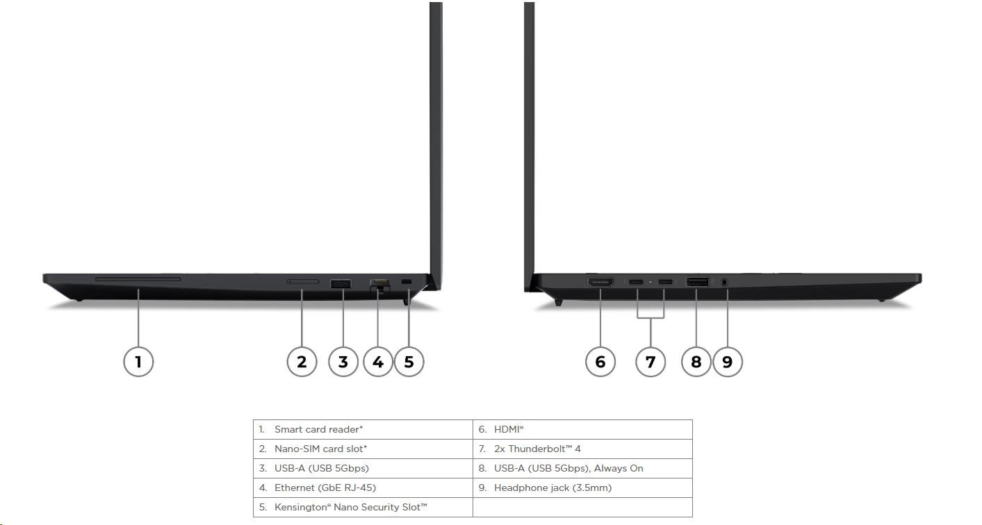 | Standartné porty | 1x USB-A (USB 5Gbps / USB 3.2 Gen 1) 1x USB-A (USB 5Gbps / USB 3.2 Gen 1), Always On 2x Thunderbolt™ 4, with USB PD 3.0 1x HDMI® 2.1, up to 4K/60Hz 1x Headphone / microphone combo jack (3.5mm) 1x Ethernet (GbE RJ-45) 1x Security keyhole 1x Smart Card Reader |