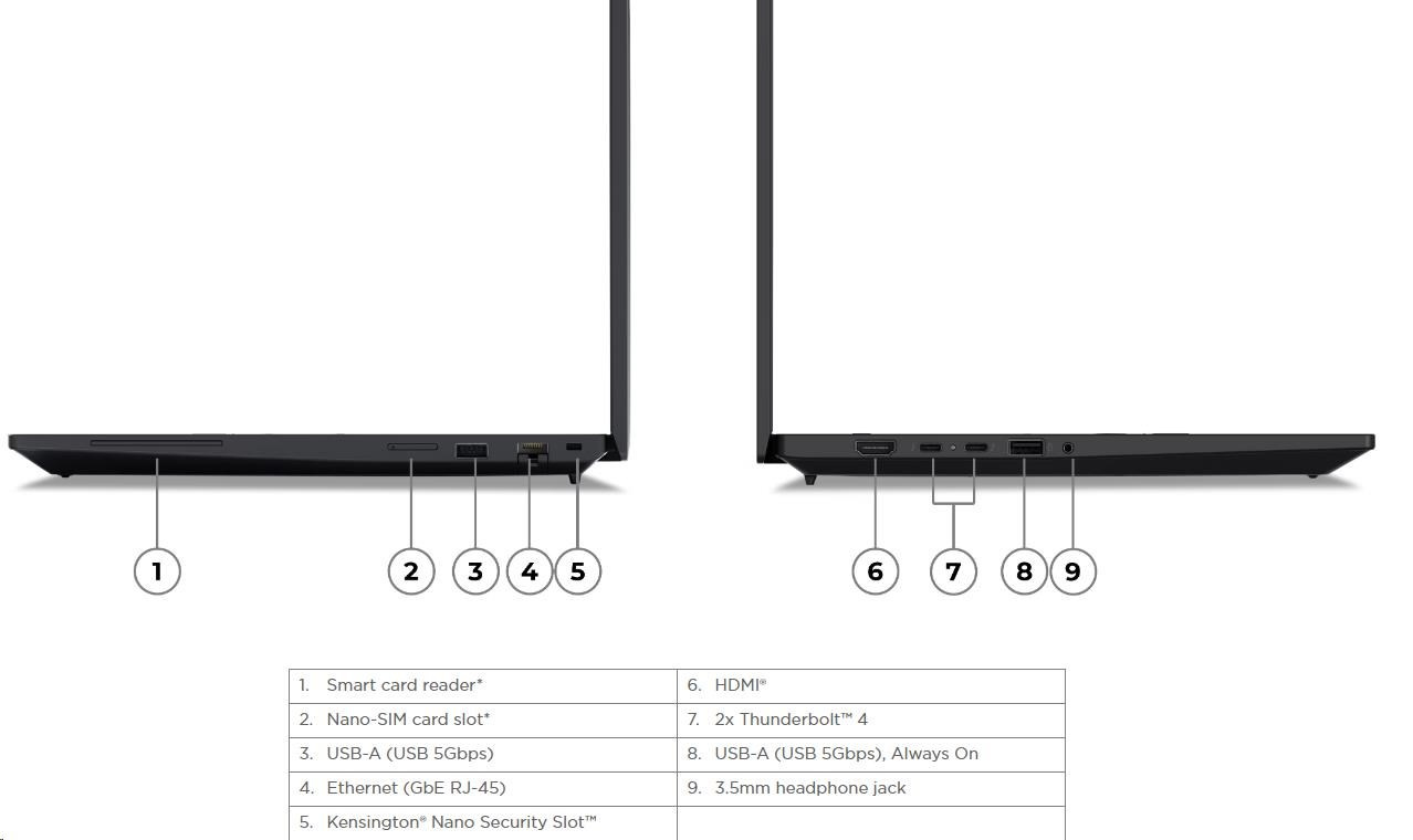 | Standartné porty | 1x USB-A (USB 5Gbps / USB 3.2 Gen 1) 1x USB-A (USB 5Gbps / USB 3.2 Gen 1), Always On 2x USB-C® (Thunderbolt™ 4 / USB4® 40Gbps), with USB PD 3.0 and DisplayPort™ 2.1 1x HDMI® 2.1, up to 4K/60Hz 1x Headphone / microphone combo jack (3.5mm) 1x Ethernet (RJ-45) 1x Security keyhole |