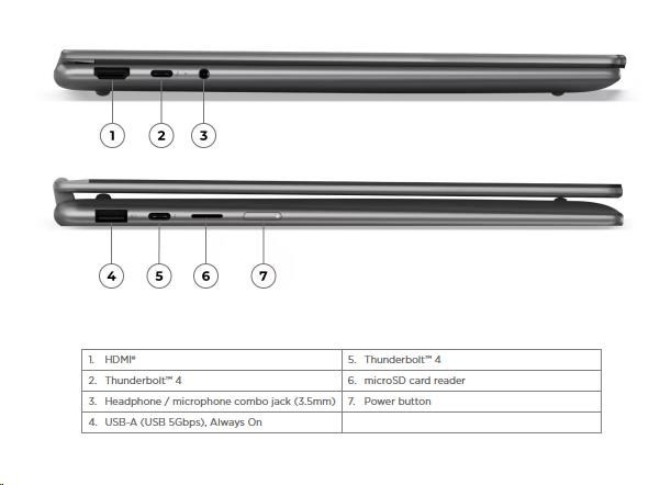 | Standartné porty | 1x USB-A (USB 5Gbps / USB 3.2 Gen 1), Always On 2x USB-C® (Thunderbolt™ 4 / USB4® 40Gbps), with USB PD 3.0 and DisplayPort™ 2.1 1x HDMI® 1.4b 1x Headphone / microphone combo jack (3.5mm) 1x microSD card reader |