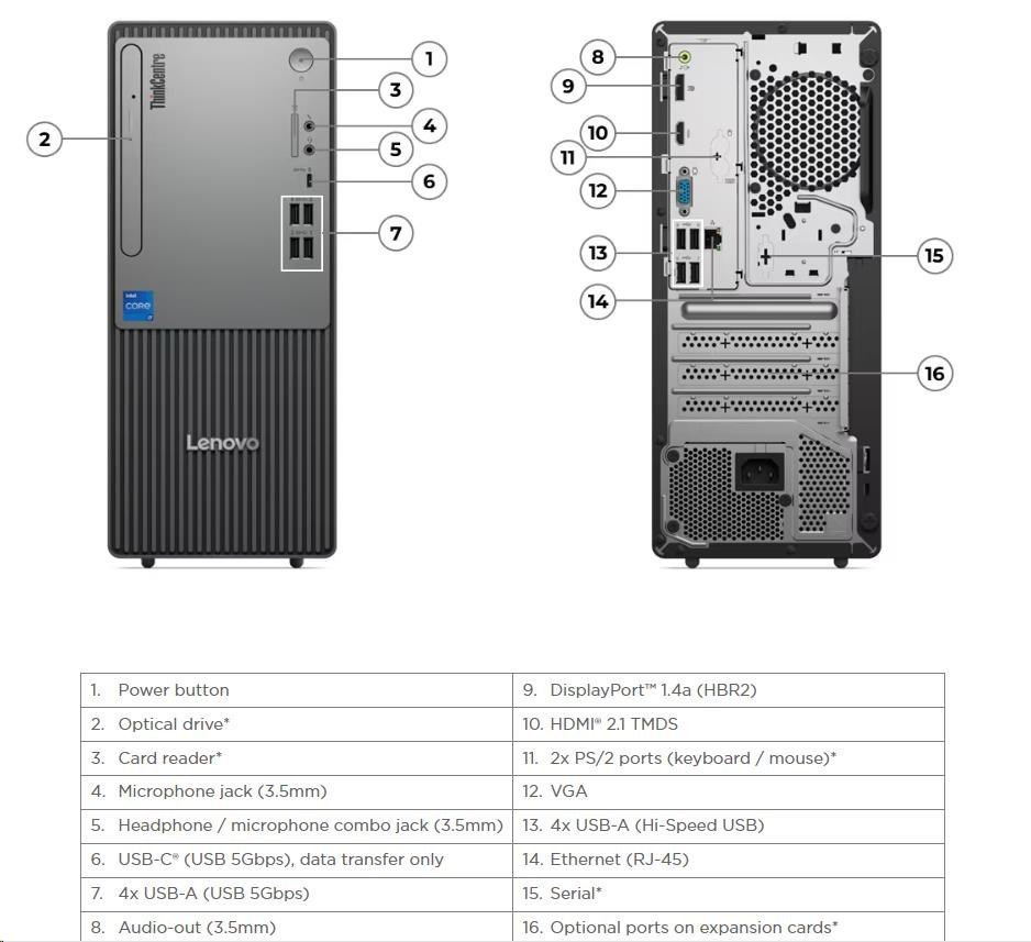 | Predné porty | 1x USB-C® (USB 5Gbps / USB 3.2 Gen 1), with data transfer and 15W charging 4x USB-A (USB 5Gbps / USB 3.2 Gen 1) 1x headphone / microphone combo jack (3.5mm) 1x microphone (3.5mm) |