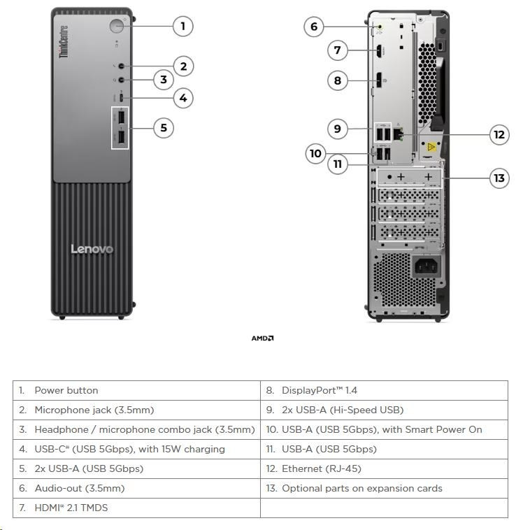 Prevedenie PC:SFF (Small Form Factor); Operačný systém:Windows 11 Pro; Typ procesora:AMD Ryzen 5; Grafický čip:AMD Radeon 740M; Typ disku:SSD; Rozhranie:LAN (RJ-45), USB 3.2 Gen 1, HDMI, 3.5mm Jack, DisplayPort, USB Type-C; Výbava PC:Klávesnica + myš, Integrovaný reproduktor; Druh optickej mechaniky:Bez optickej mechaniky.prečítajte si viac