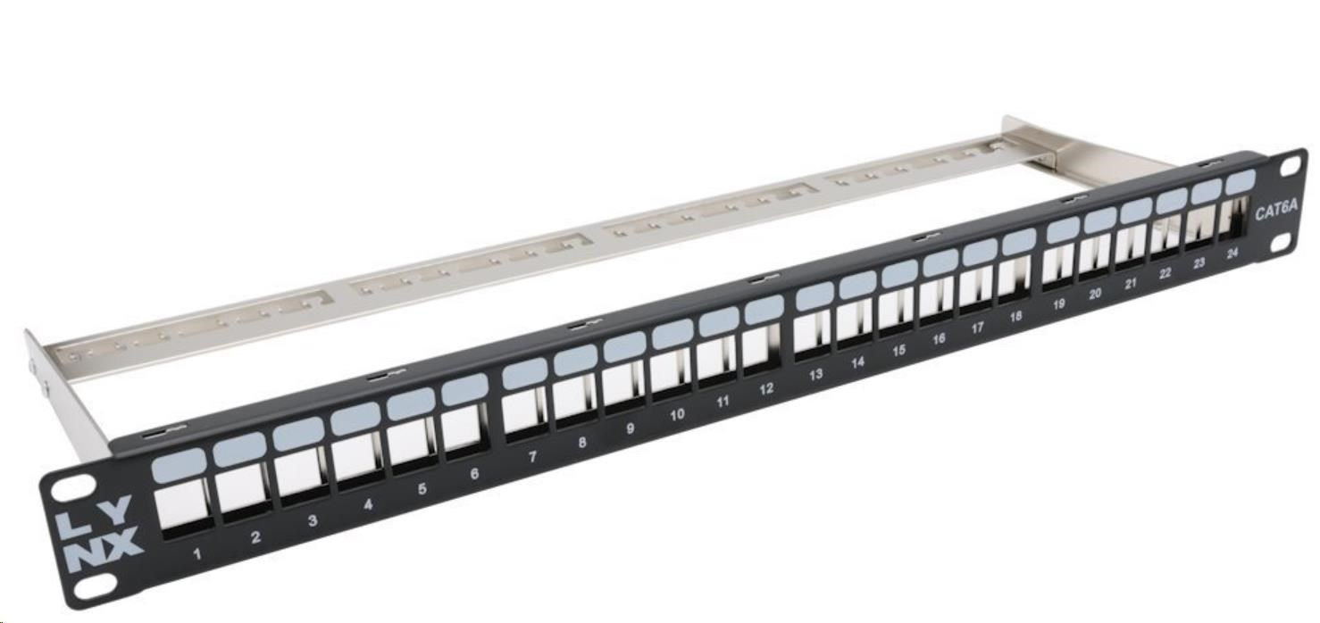 Popis LYNX Patch panel, 19'', 24 portů, 1U, Cat5e/6/6A/7, neosazený, stíněný, vyvazovák, černý