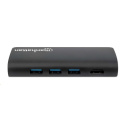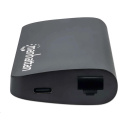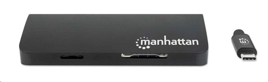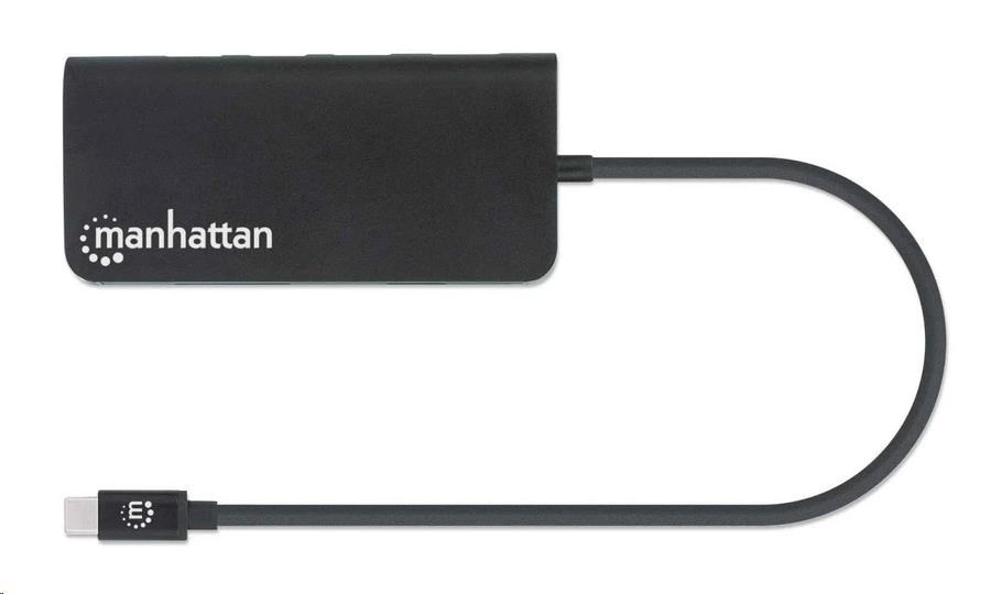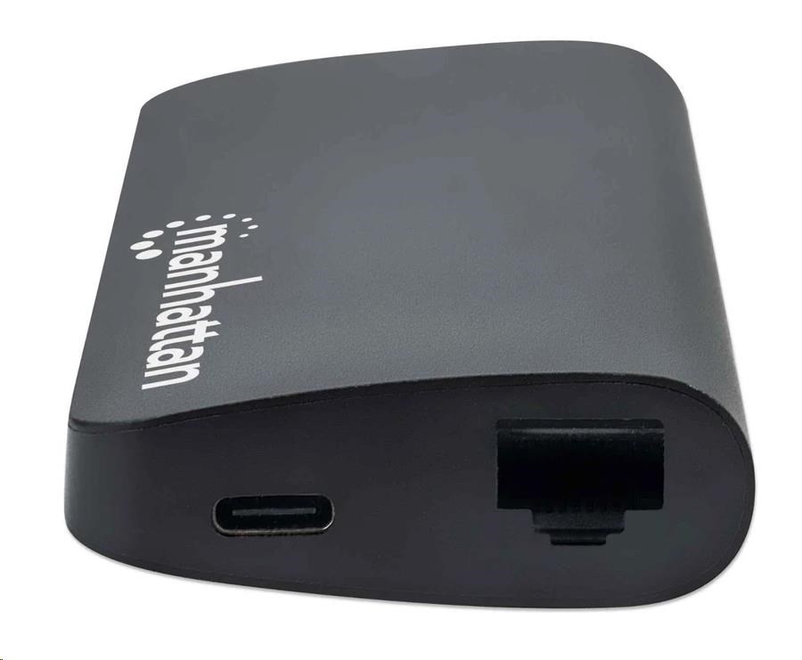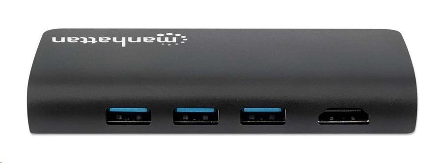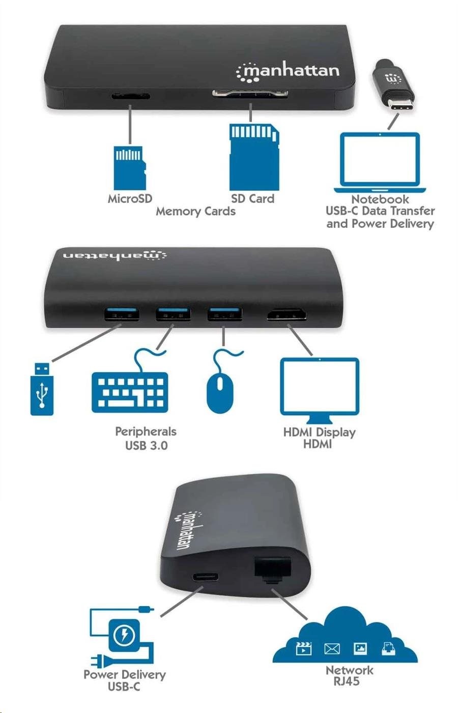 USB 3.2 Gen 1 Type-C Male to HDMI(4K@30Hz) Female, tri porty USB-A SuperSpeed, USB-C Power Delivery (PD 3.0) Port, gigabitový port RJ45 a čítačka kariet SD/MicroSD; hliník, čierna farba