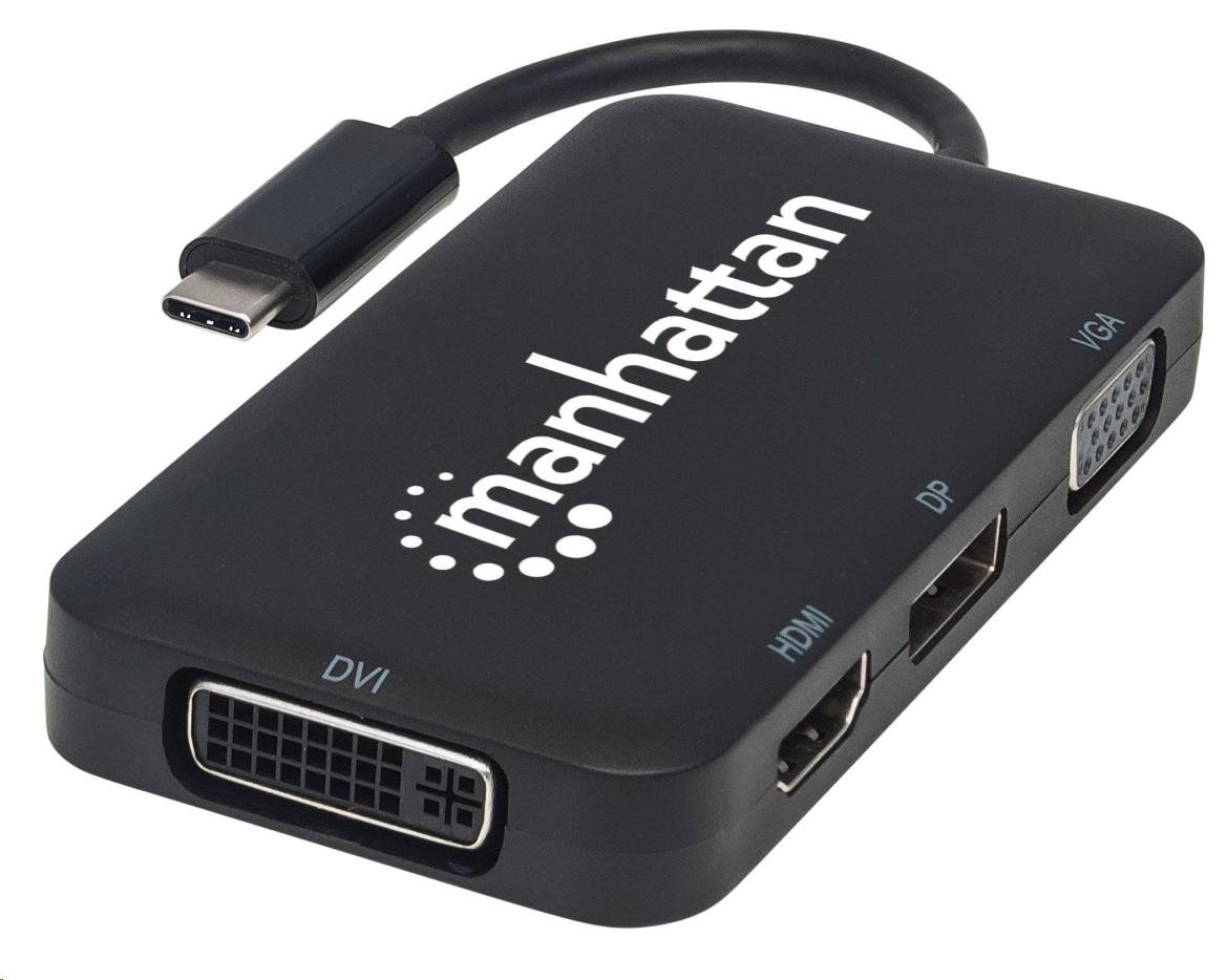 Prevodník Manhattan USB-C 4 v 1 Audio/Video vytvára rýchle, jednoduché a pohodlné prepojenie medzi novšími zdrojmi médií vybavenými rozhraním USB typu C (počítače, tablety, smartfóny atď.) a existujúce displeje HDMI, DisplayPort, VGA alebo DVI (monitory, projektory atď.). Prevodník Manhattan USB-C 4 v 1 Audio/Video sa ľahko a rýchlo inštaluje - nie je potrebná žiadna zložitá konfigurácia ani nastavenie. Vďaka dizajnu "všetko v jednom" sa dosiahlo kompaktné, integrované riešenie, ktoré eliminuje zbytočné káble, spleť a neporiadok, aby boli inštalácie a pracovné priestory čisté a usporiadané. Predĺžte životnosť svojho zariadenia a plne využite investície a hodnotu svojich displejov HDMI, DP, VGA alebo DVI, projektorov a periférnych zariadení pomocou prevodníka Manhattan USB-C 4 v 1 Audio/Video.