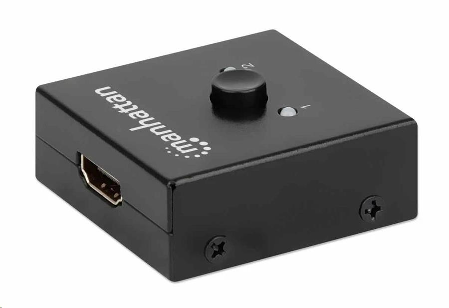 Dvojsmerný 2-portový rozdeľovač HDMI Manhattan 4K so zabudovaným zosilňovačom umožňuje zdieľať signál 4K HDMI z jedného zdroja UHD na jednom z dvoch displejov UHD alebo pripojiť dva zdroje UHD a prepínať medzi nimi na jednom displeji UHD.