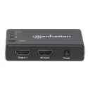 Manhattan 4K 4-portový rozdeľovač HDMI so zabudovaným zosilňovačom prenáša signál 4K HDMI z jedného zdroja UHD až na štyri displeje UHD.