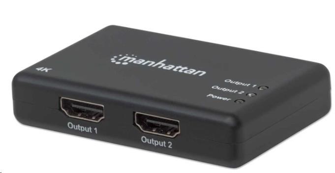 Manhattan 4K 2-portový rozdeľovač HDMI so zabudovaným zosilňovačom prenáša signál 4K HDMI z jedného zdroja UHD až na dva displeje UHD.