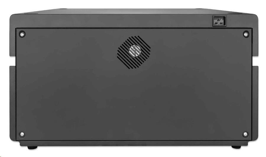 Udržujte svoje zariadenia usporiadané v 20 priehradkách s rozmermi 264 (D) x 22 (Š) x 235 (V) mm/10.39 x 0.87 x 9.25 in. každý. Na usporiadanie nabíjacích káblov použite káblový manažment zabudovaný v priehradkách (k dispozícii v spoločnosti Manhattan). Keďže táto stolová nabíjacia skrinka je vybavená portami USB-C namiesto sieťových zásuviek, nepotrebujete ďalšie sieťové nabíjačky. Vstup striedavého prúdu na zadnej strane je konektor C20, ktorý umožňuje nahradiť dodaný napájací kábel iným káblom podľa vašej oblasti.