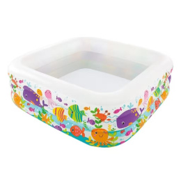 S nafukovacím bazénom Aquarium si deti od 3 rokov užijú veľa zábavy. Má štvorcový tvar, príjemnú modrú farbu, ktorá navodzuje efekt farby vody v oceáne.