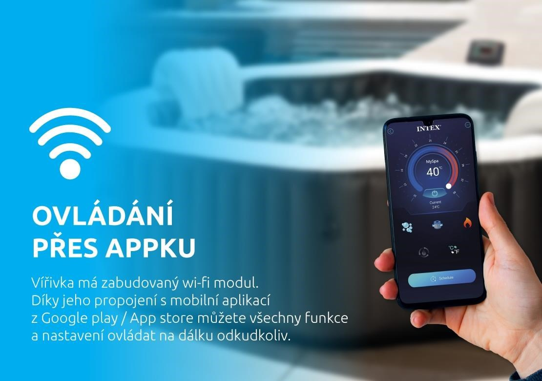 Vírivka má zabudovaný wi-fi modul, vďaka jeho prepojeniu s mobilnou aplikáciou z Google play / App store si môžete všetky funkcie a nastavenia ovládať na diaľku odkiaľkoľvek. Dokonalú relaxačnú kúpeľňu tak stihnete pripraviť ešte pred vaším príchodom.
