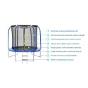 Vnútornú ochrannú sieť nájdete priamo v balení, nemusíte si ju dokupovať zvlášť. Vnútorná ochranná sieť je bezpečnejšia než vonkajšia sieť - bráni prístupu skákajúceho do časti s pružinami. Vstupný priestor je zabezpečený tromi sponami a bráni vypadnutiu. Tyče sú obalené ochranným návlekom z mäkčenej peny. Nohy trampolíny sú samostatné a zvyšujú stabilitu celej trampolíny. Spojenie tyčí nôh trampolíny a siete je poistné špeciálnymi sponami.