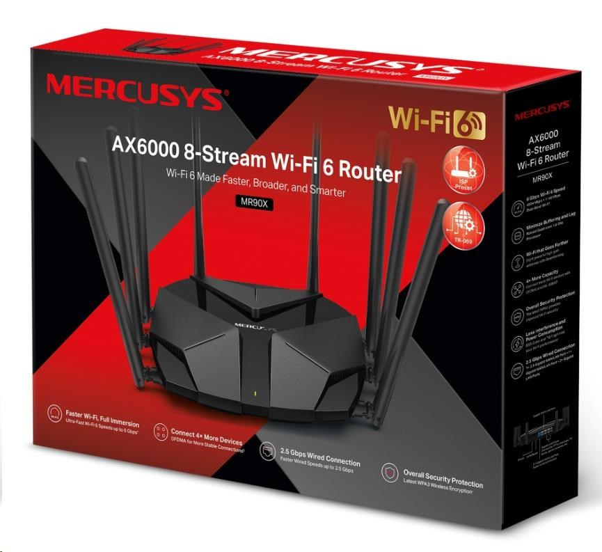 | Package Contents | AX6000 8-Stream Wi-Fi 6 Router MR90X • Napájací adaptér • Rýchly Sprievodca inštaláciou • RJ45 Ethernetový kábel |