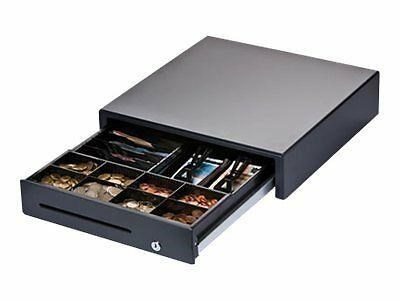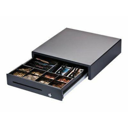 cash drawer, front opening, dimensions (WxHxD): 410x114x415mm, insert: 6 note compartments, 8 coin compartments, 1 receipt compartment, direct printer connection, RJ12, colour: dark grey