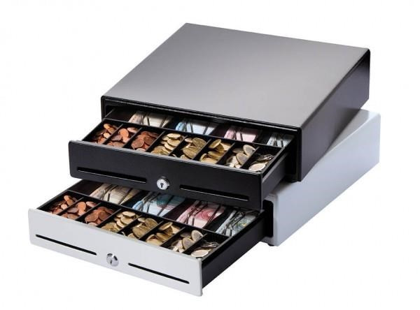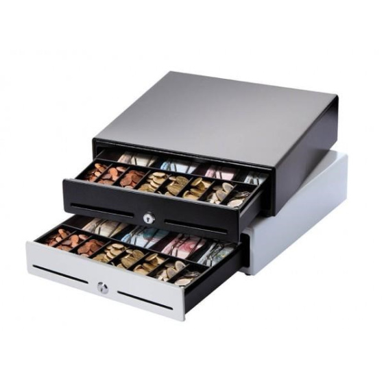 zásuvka na hotovosť, predné otváranie, rozmery (Š x V x H): 330x101x330mm, vložka: 4 priečinky na bankovky (vodorovne), 8 priečinkov na mince, 1 priečinok na účtenky, zámok 3-polohový, priame pripojenie tlačiarne, RJ12, farba: čierna Popis produktu bol preložený pomocou umelej inteligencie a môže obsahovať nepresnosti.