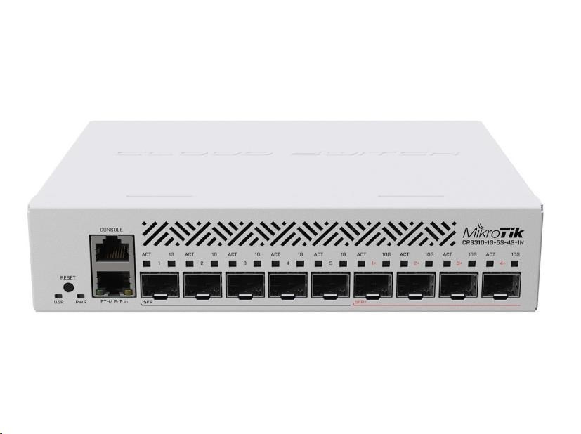 CRS310-1G-5S-4S+IN Optical Cloud Router Switch je vhodným riešením pre stolný počítač alebo 19" rack a zároveň menší centrálny optický prepínač, ktorý ponúka 5× SFP rýchlosť 1G,4× SFP+ s rýchlosťou 1G/10G, 1× Gigabit Ethernet porty podporu pasívneho PoE napájania a konzolový RJ45 port, výpočtový výkon zabezpečuje moderný ARM CPU v7, 256 MB RAM, ktorý je doplnený aktívnym chladením na zadnej strane. Prepínač je možné napájať ako cez DC konektor, tak aj cez ethernetový port podporujúci pasívne PoE s napätím 18 - 57 VDC.