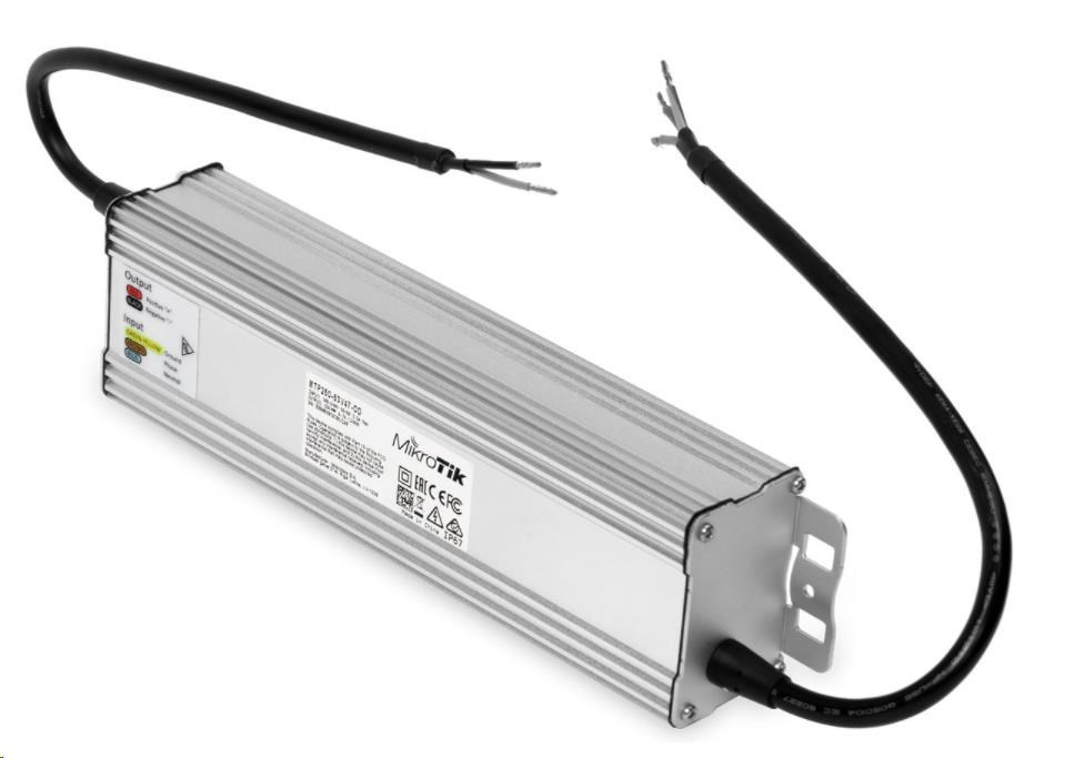 Vonkajší AC/DC zdroj v odolnom kovovom šasi s výstupným napätím 26 V, max. výstupný prúd 9.4 A, 250 W celkový výkon vhodný pre produktový rad netPower spoločnosti MikroTik. Šasi má certifikát IP67 s extra ochranou proti prachu a vlhkosti. Napájací zdroj je ukončený dvoma oddelenými káblami bez konektorov - vstupným 3-žilovým káblom 230 V AC (100 - 240 V AC) a výstupným káblom DC