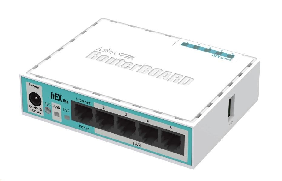 MikroTik RouterBOARD hEX lite, 850MHz CPU, 64MB RAM, 5x LAN, vrátane. Licencia L4