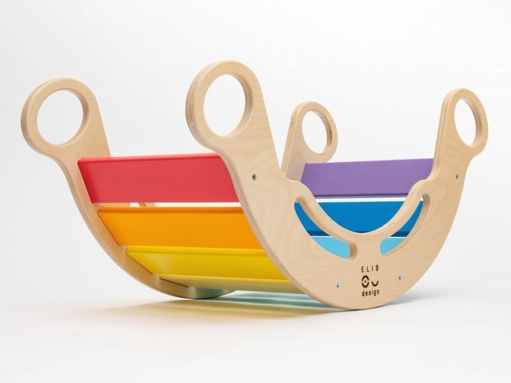 Veľmi kvalitná, bezpečná, hravá a vylepšená Montessori dúhová hojdačka 5v1 od ELIS DESIGN v úžasných sviežich, pestrých farbách, podporí správny motorický rozvoj vášho dieťaťa. Jej všestranné využitie umožní deťom používať hojdačku nielen na hojdanie, ale aj ako šmýkačku, úkryť, preliezačku alebo sedačku. Hojdačka (rainbow rocker) je vyrobená z tých najkvalitnejších materiálov, ručne dôkladne opracovaná a poctivo lakovaná farbami s atestom. Krásne farebná drevená hojdačka je vhodná pre deti od 1 do 6 rokov.