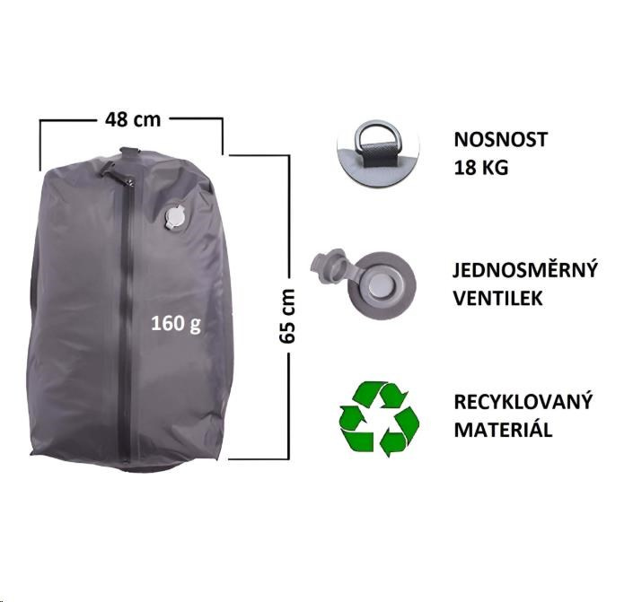 Do vaku Vacuo bag sa toho vojde naozaj veľa. So rozmermi 65 x 45 cm ponúka veľa priestoru pre vaše veci. Počas cestovania vás vďaka svojej nízkej hmotnosti 0,16 kg nijak nezatíži.