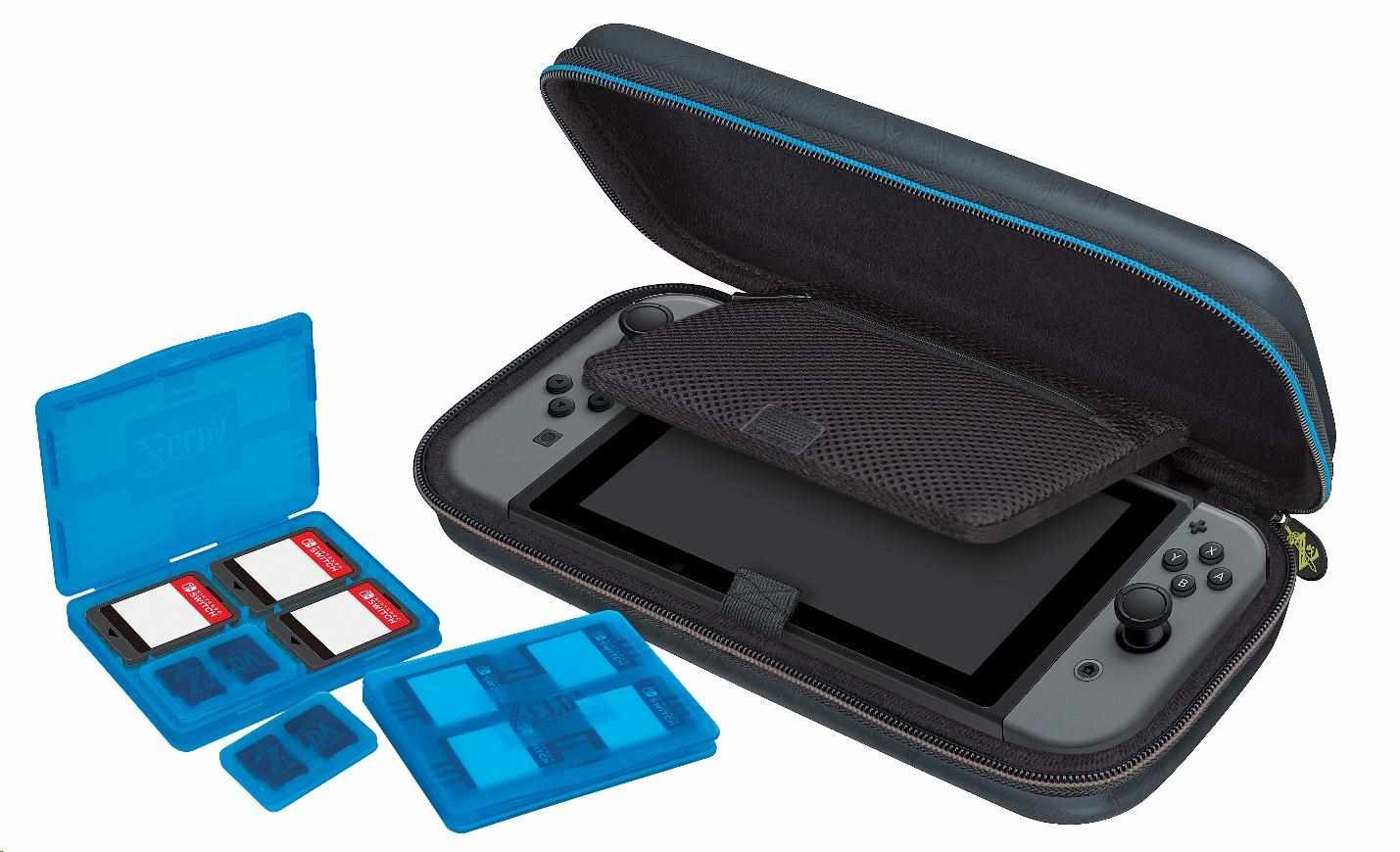 V tomto luxusnom cestovnom kufríku s témou akčnej adventúry Legend of Zelda™: Breath of the Wild môžete bezpečne a bezpečne prepraviť svoju obľúbenú hernú konzolu Nintendo Switch™. Polstrovaná prepážka v strede puzdra chráni obrazovku konzoly pred poškriabaním a sieťované vrecko na zips na druhej strane môže ukladať karty s inými hrami.