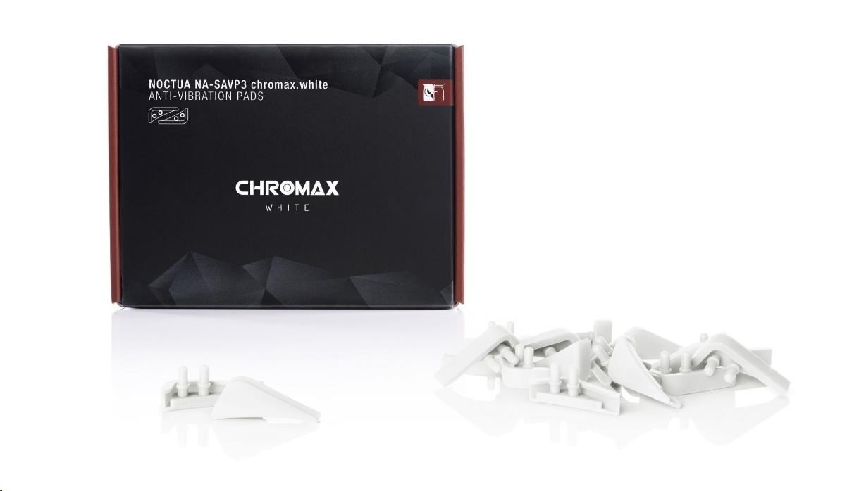 Balenie Noctua NA-SAVP3 chromax.white obsahuje 16 extra jemných silikónových podložiek určených na zníženie prenosu vibrácií. Tieto podložky sú určené pre zaoblené 140mm ventilátory, ako napríklad Noctua NF-A15. Štýlová biela farba tiež krásne dokáže dodať jemný akcent obľúbenej sérii čierno-čiernych ventilátorov a to napríklad u NH-D15, kedy môžete vďaka podložkám zladiť elegantnú čiernu farbu so zvyškom stroja.