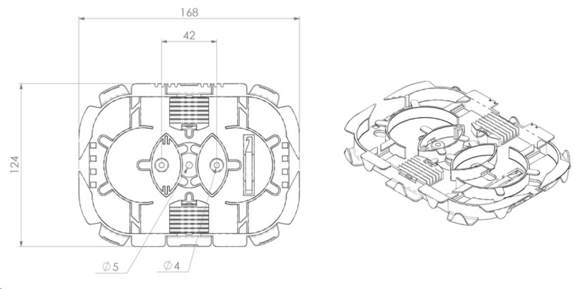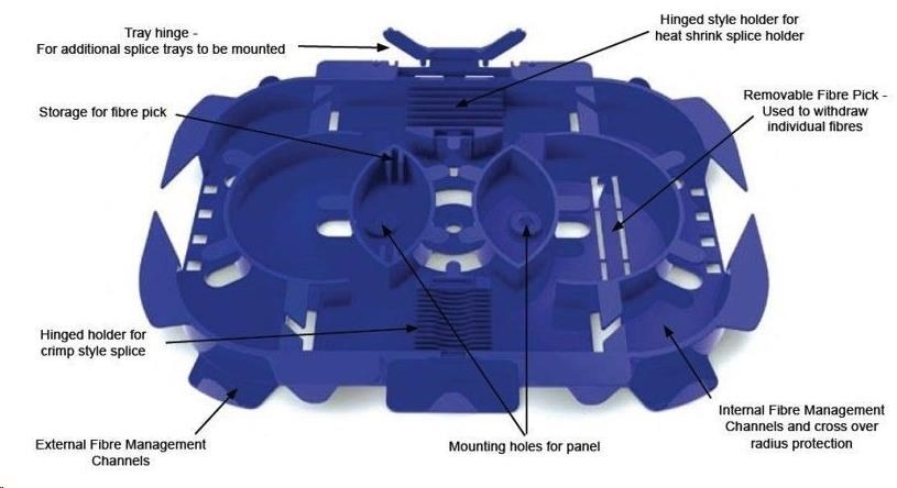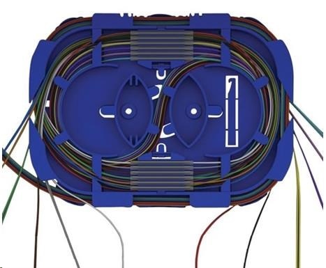 • dva hrebene s celkovou kapacitou 24 chráničov zvarov. (Uloženie a konštrukcia výklopných hrebeňov umožňuje viesť vlákna aj pod nimi
