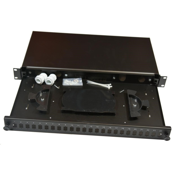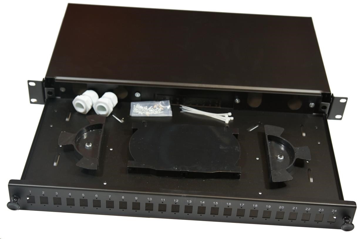 1U optický výsuvný zásobník, 24x SC simplex spojky (24x LC Duplex, 24x E2000), vrátane kazety na 24 zvarov, čierny
