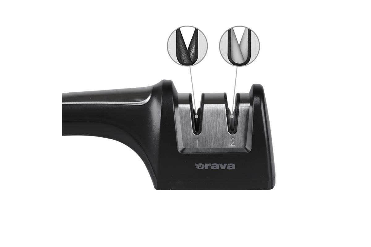 Ručná bruska na nože, 2-stupňový ostrící systém: diamantové kotúče na hrubé brúsenie a keramické na jemné doostrenie, Vhodná pre rovné aj zoubkované ostre, Vodicí drážky pre čepel automaticky udržiavajú potrebný uhol, Soft Touch rukoväť pre jednoduchú a bezpečnú manipuláciu