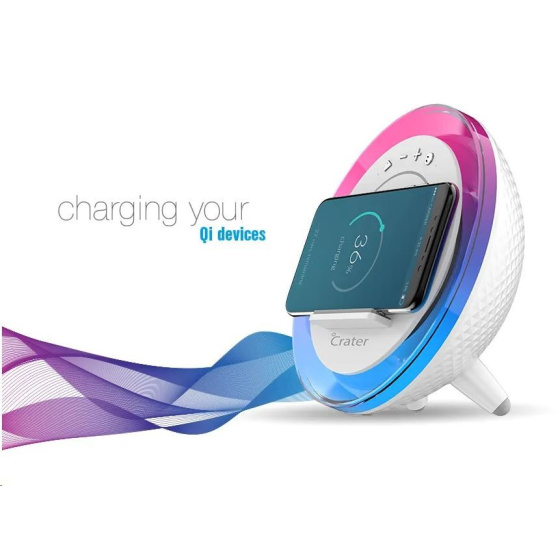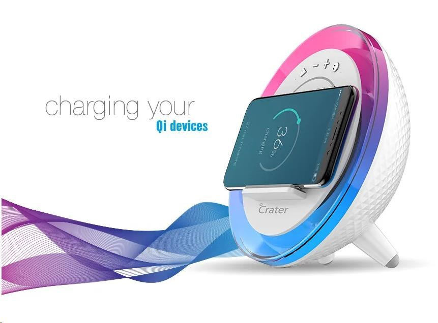 V neposlednom rade využijete Crater-9 tiež na doplnenie „šťavy“ pre váš smartphone. Na nabíjanie využíva bezdrôtovú Qi technológiu s výkonom 10 W, čo je nielen pohodlné, rýchle, ale aj šetrné. Vyhnete sa hľadaniu nabíjacieho kábla a jeho zbytočnému ohýbaniu a šetríte aj nabíjacie porty mobilného telefónu. Smartfón stačí položiť na vyznačenú plochu určenú na nabíjanie, kde sa vám mobil s podporou Qi technológie elegantne nabije, aj keď práve počúvate hudbu alebo sladko spíte.