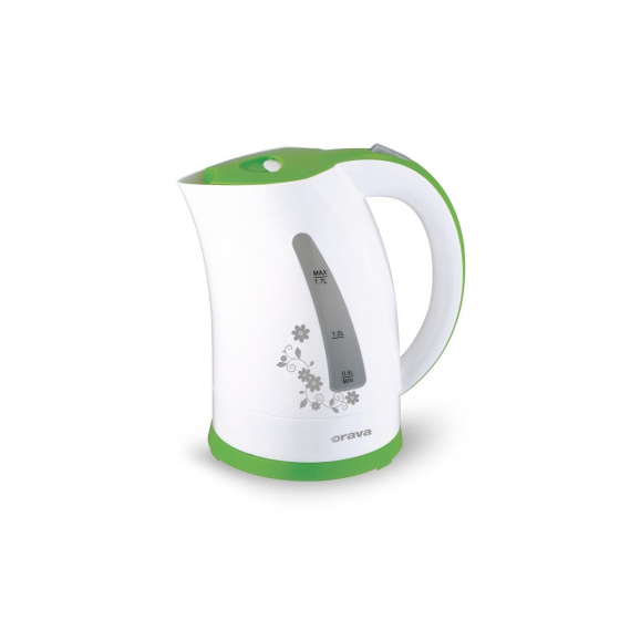 Varná konvice Orava 1,7L VK-3417G s príkonom 2000W a objemom vody 1,7L. Tepelné teleso prekryté doskou z ušľachtilej ocele.