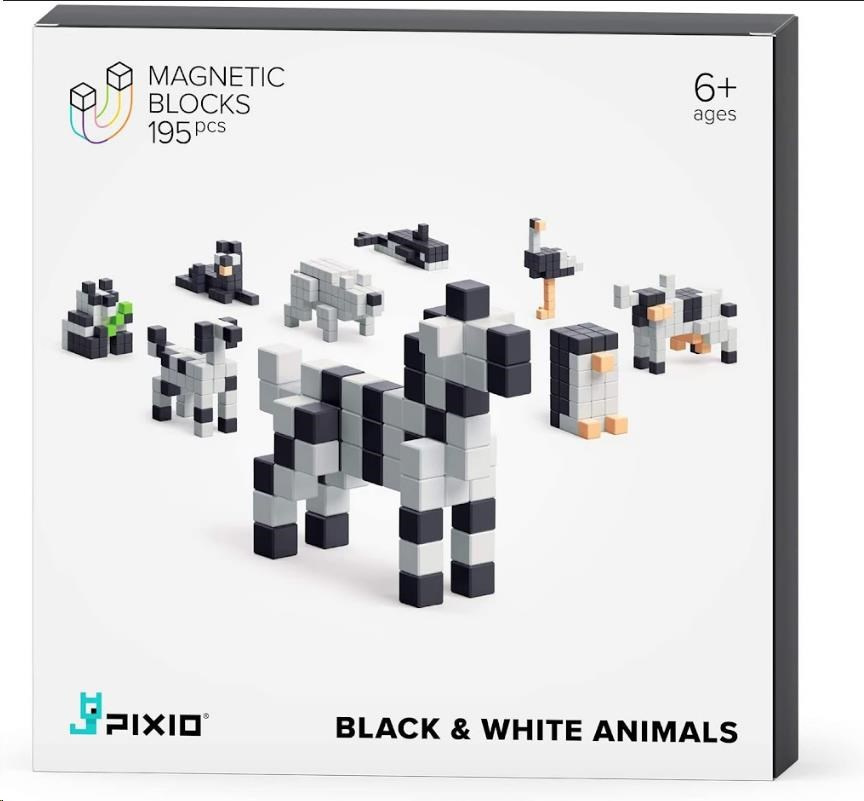 Dizajnová séria PIXIO BLACK AND WHITE Animals obsahuje 195 PIXIO blokov v 4 farbách. Umožňuje