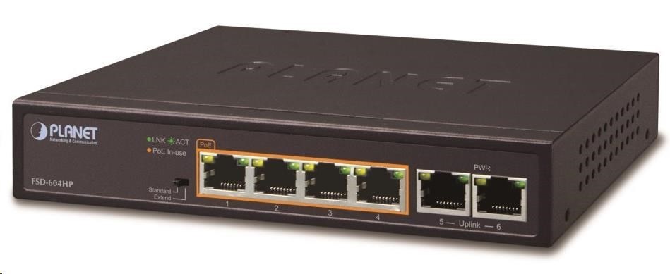 6portový 10/100Base-TX PoE switch vrátane 4x Power over Ethernet injektoru (napájacieho zdroja) IEEE 802.3at, celkový výkon do 60 W.