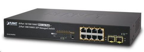 Popis Planet GS-4210-8P2S PoE+ switch 8x 10/100/1000Base-T, 2x SFP, 802.3at do 120W, VLAN, SNMP/WEB