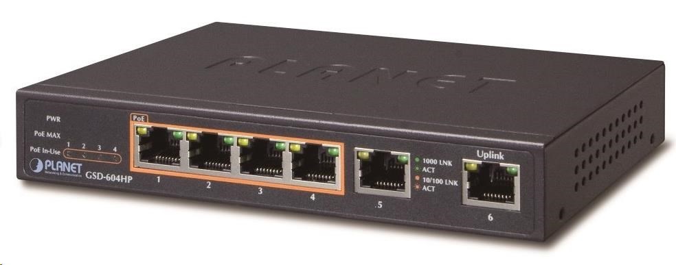 Gigabitový 6portový prepínač so 4 portami PoE (napájanie cez ethernet) na centralizované napájanie zariadení cez ethernet, ako sú IP kamery, prvky WiFi alebo telefóny VOIP. Zariadenie je vhodné na inštaláciu v domácich alebo kancelárskych priestoroch, je vhodné aj na použitie v miestnych rozvádzačoch. Portové siete VLAN zabezpečujú oddelenú prevádzku medzi napájanými portami, zatiaľ čo porty bez PoE slúžia ako uplinky a na združovanie prevádzky na pripojenie NVR alebo NAS.