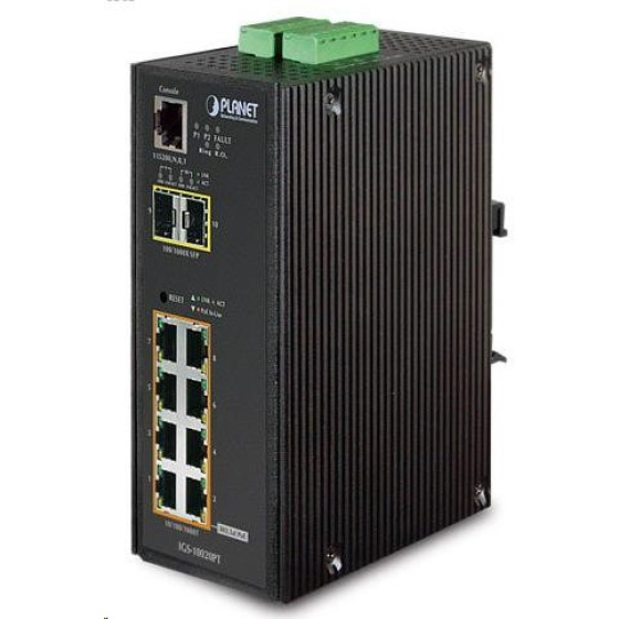Popis Planet IGS-10020PT PoE switch 8x 1000Base-T, 2x SFP, 802.3af 130W, IP30, -40 až 75°C, SNMP, IGMPv3, IPv6
