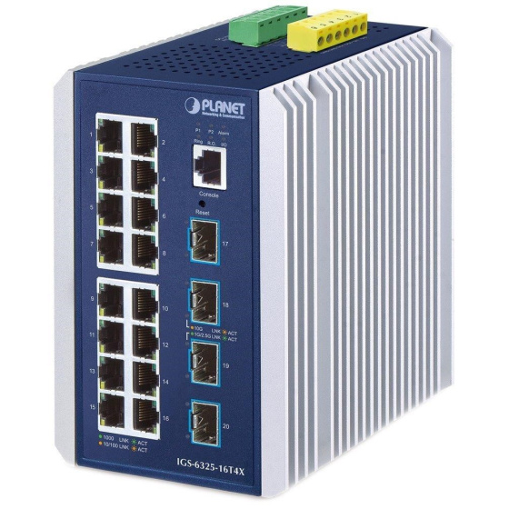 PLANET IGS-6325-16T4X Průmyslový prepínač a konvertor 16× RJ-45 10/100/1000Base-T, 4× SFP+ 10GbBase-SR/LR, 2× digitálny vstup DI, 2× digitálny výstup DO. Duálne napájanie v rozsahu DC 9–48 V / AC 24 V, krytie IP30, hliníková skrinka, pracovná teplota -40 až +75 °C, prepäťová ochrana ESD do 6 kV, montáž na DIN lištu alebo priamo na stenu. Prepínače pre priemyselný Ethernet sú určené do náročných prevádzkových podmienok s veľkým rozsahom pracovných teplôt, neistým napájaním a častými otrasmi. Prepínače rady IGS sa ľahko inštalujú na štandardnú DIN lištu alebo priamo na stenu a umožňujú nasadenie dobre známej Ethernetovej technológie aj v priemyselnom prostredí. Rovnako sú vhodné pre inštalácie do vonkajších skríň s veľkým kolísaním pracovných teplôt (typicky bezdrôtové a MAN ISP aplikácie). ZÁKLADNÉ ŠPECIFIKÁCIE Fyzické vlastnosti: Porty: 16× RJ-45 10/100/1000 Base-T, 4× SFP+ 10Gb Base-SR/LR, 1× konzolový port RJ-45 (RS-232), 2× digitálny vstup DI, 2× digitálny výstup DO Pamäť: 32k MAC adries Prechodnosť: zbernica 112 Gbps, prevádzka 83,3 Mpps (64B) Podpora prenosu: JumboFrame 10 KB Uvedenie: DIN lišta, na stenu Napájanie: 9–48 V DC duálne s 24 V AC, celkový príkon 14,4–24 W (zdroj nie je súčasťou balenia) Ochrana: ESD do 6 kV DC, ochrana proti polarizácii Prevádzková teplota: -40 až +75 °C Rozmery: 152 × 107 × 96 mm Hmotnosť: 1503 g Funkcie administrácie: Správa: konzola cez RJ-45, Telnet, Web, SNMP v1/v2c/v3, SSHv2, TLS Riadenie prístupu: Protokol ACL založený na IP a MAC L3 routing: max. 128 VLAN rozhraní, max. 128 pravidiel, OSPFv2/v3, RIPv1/v2 ACL filtr a bonding: IP ACL, filtrace prevádzok podľa IP adries, protokolu, portu, TCP príznakov, až 256 pravidiel MAC ACL, filtrace prevádzok podľa MAC adries, podľa VLAN ID a kombinácií príznakov priorít, až 256 pravidiel Prioritizácia prevádzky QoS: 8 úrovní, priorizácia prevádzky podľa DSCP/ToS, čísla portu, 802.1p priority, alebo 802.1Q VLAN tagu Podpora VLAN: IEEE 802.1Q až 4K VLAN skupín Q-in-Q tunneling Private VLAN Edge (PVE) Protokolová VLAN MAC založené VLAN IP Subnet založené VLAN Voice VLAN Multicast VLAN GVRP Spanning Tree Protocol: protokol STP, protokol IEEE 802.1d Spanning Tree protokol RSTP, protokol IEEE 802.1w Rapid Spanning Tree protokol MSTP, protokol IEEE 802.1s Multiple Spanning Tree Agregácia liniek: IEEE 802.3ad LACP, 16 portov v 10 skupinách Multicast: IGMP v1/v2/v3, podpora režimu IGMP querier mode, až 255 IGMP skupín, MLD v1/v2 Autentifikácia pripojených zariadení: IEEE 802.1x, RADIUS/TACACS+ LLDP: áno (automatická detekcia typu pripojených zariadení) Diagnostika káblov: áno Priemyselné vlastnosti: zarízení je odolné proti pádu (IEC-60068-2-32) z výšky 75 cm na všetky dopadové časti zarízení je odolné proti vibráciám (IEC-60068-2-6) zarízení je odolné proti preťaženiu krátkodobému zrýchleniu 50g, dlhodobému 4g, (IEC-60068-2-27)