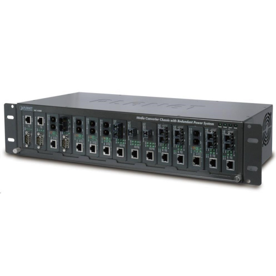 Kovové šasi na inštaláciu až pätnástich mediálnych konvertorov v jednej 2,5U skrini. Skriňa má vlastný zdroj napájania pre meniče, a tým výrazne znižuje priestorové nároky meničov. Obsahuje záložný napájací slot pre prípad výpadku hlavného napájania. Dôležité je aj výkonné chladenie. Jednotlivé meniče sa ľahko inštalujú zasunutím spredu.