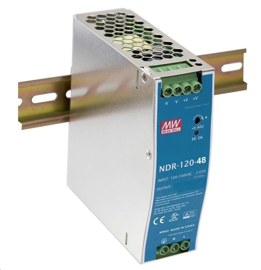 Napájanie pre inštaláciu na DIN lištu. Výstupné napätie 48 V DC, zaťažiteľnosť 120 W. Prevádzková teplota -10 až 60 °C. ZÁKLADNÉ ŠPECIFIKÁCIE Výstupné napätie: 48-56 V DC Výstupný výkon: 120 W Vstupné napätie: 100 - 240 V AC Certifikácia: CE EN-60950-1 Rozmery: 65 x 100 x 125 mm Hmotnosť: 0,79 kg..