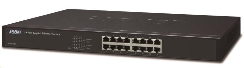 GSW1601 je vybavený 16 portami 10/100/1000 Mb/s. Prepínacia kapacita dosahuje až 32 Gb/s.