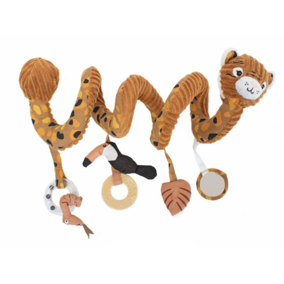 Originálna špirála na postieľku, na kočík alebo na hrazdičku, v podobe roztomilého tigra upúta pozornosť každého bábätka. Úžasne hebká špirála s chrastítkom, zrkadielkom, hryzátkom aj šuštiacim lístkom stimuluje detské zmysly, rozvíja jemnú motoriku a koordináciu očí a rúk. Prezrite si originálnu špirálu, ktorá vykúzli úsmev na tvári deťom aj rodičom.
