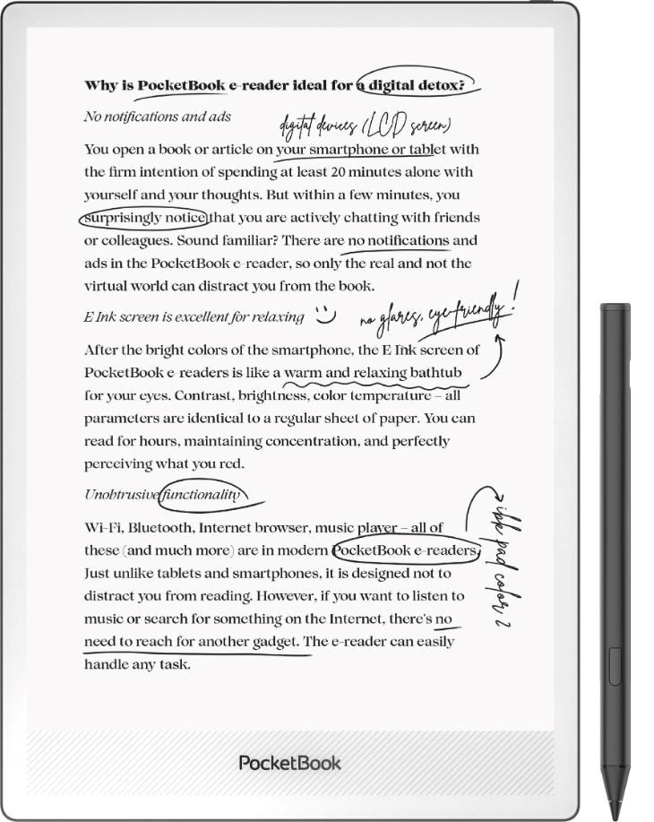 InkPad One je 10,3" čtečka elektronických knih s dotykovým perem, navržená pro aktivní čtení a pohodlné psaní rukou. Zařízení je vybaveno displejem E Ink Mobius™ s papírovým vzhledem a dodává se s aktivním digitálním perem pro přirozené pořizování poznámek. Nabízí širokou škálu integrovaných nástrojů pro psaní. InkPad One je cenově dostupné řešení s velkou obrazovkou pro čtení, psaní a každodenní produktivitu.