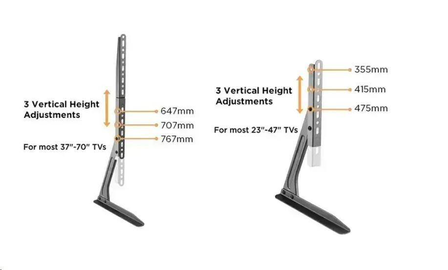 Televízne nohy s nosnosťou 50 kg, pre televízory s uhlopriečkou 37" až 65", nastaviteľná výška Stabilný televízny podstavec, univerzálny, vhodný pre všetky typy, veľkosti a značky televízorov s podporou VESA. Nastavenie výšky, nosnosť 50 kg, farba čierna, záruka 3 roky. Balenie obsahuje sadu inštalačného materiálu. Podstavec na televizi, nožky na Tv Ergosolid Castor 1 Technické údaje: nosnost 50kg podpora VESA standardů 100x100 až 800x500 doporučená úhlopříčka Tv 37" až 65" výškové nastevení 620mm až 683mm šířka podstavců 356mm protiskluzové podložky minimalistický design stabilní, bezpečný materiál ocel instalační materiál barevné provedení černé záruka 3 roky Ergosolid Castor 1 podporuje VESA standardy: VESA 100x100 VESA 200x100 a 100x200 VESA 200x200 VESA 300x100 a 100x300 VESA 300x200 a 200x300 VESA 300x300 VESA 400x200 a 200x400 VESA 400x300 a 300x400 VESA 400x400 VESA 600x400 VESA 800x400 VESA 800x500..